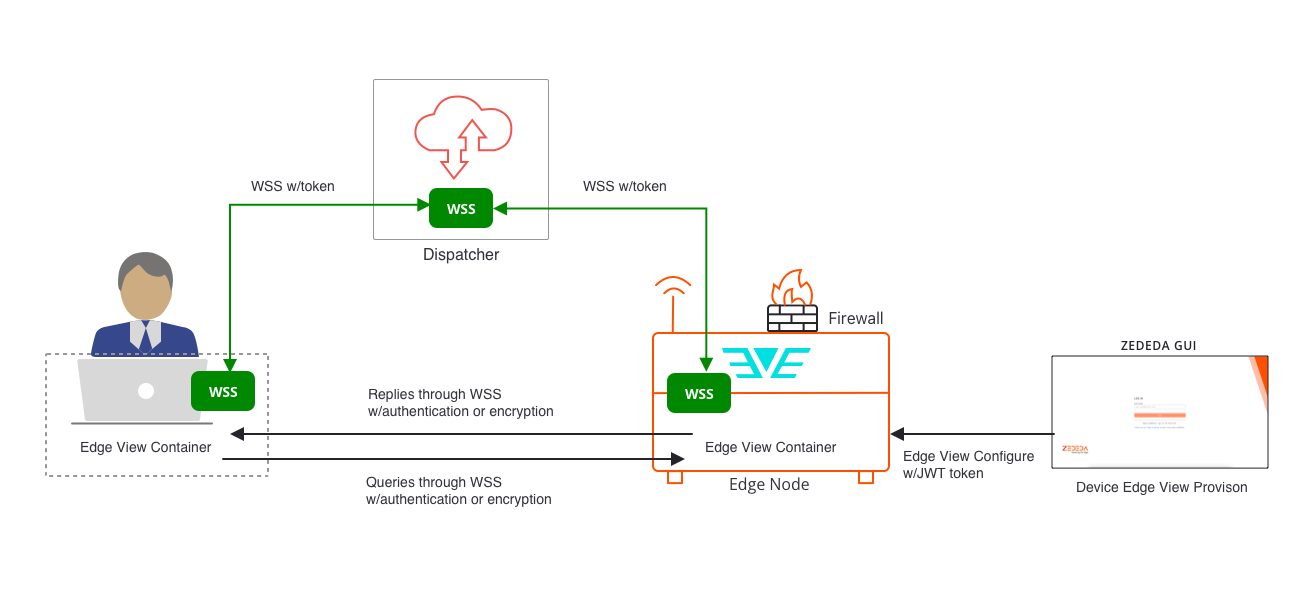 If the Edge View dispatcher were to be compromised, your session would remain secure. The dispatcher itself does not have access to the JWT token and cannot examine or modify the traffic flowing between you and the remote edge node. You can choose to enable encryption (within the Edge View policy), so the payload in your Edge View session will be protected, if desired.