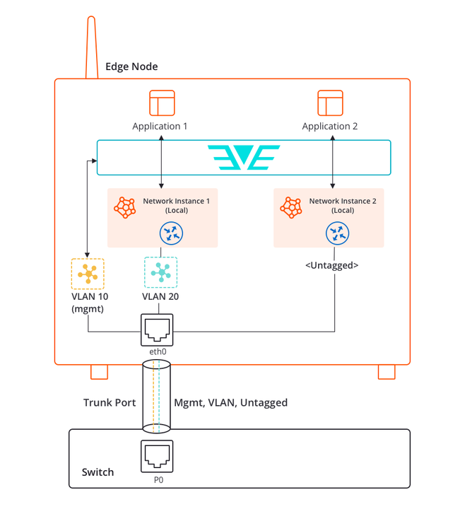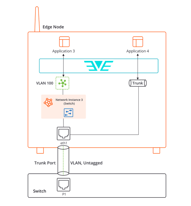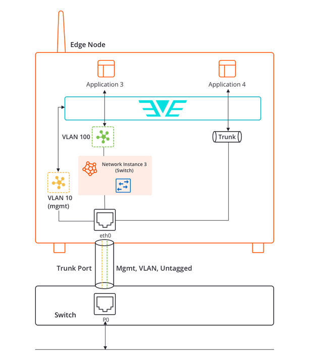- Provide L2 switching for multiple applications inside the edge node, using a Switch Network Instance with access and trunk ports.